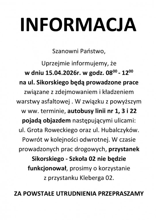 W związku z prowadzonymi pracami mogą wystąpić chwilowe utrudnienia w korzystaniu z wybranych przystanków.